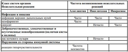 Приведенная информация основывается на данных анализа в общей сложности 3504 пациентов с СД2, включая 1908 пациентов, проходивших лечение алоглиптином и пиоглитазоном, которые участвовали в 4 двойных слепых, контролируемых по плацебо или активному веществу клинических исследованиях 3 фазы.