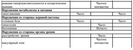 Другие реакции, такие как инфекции верхних дыхательных путей, синусит, головная боль, гипогликемия, тошнота, увеличение веса и отек могут возникать часто (от ≥ 1/100 до<1/10).